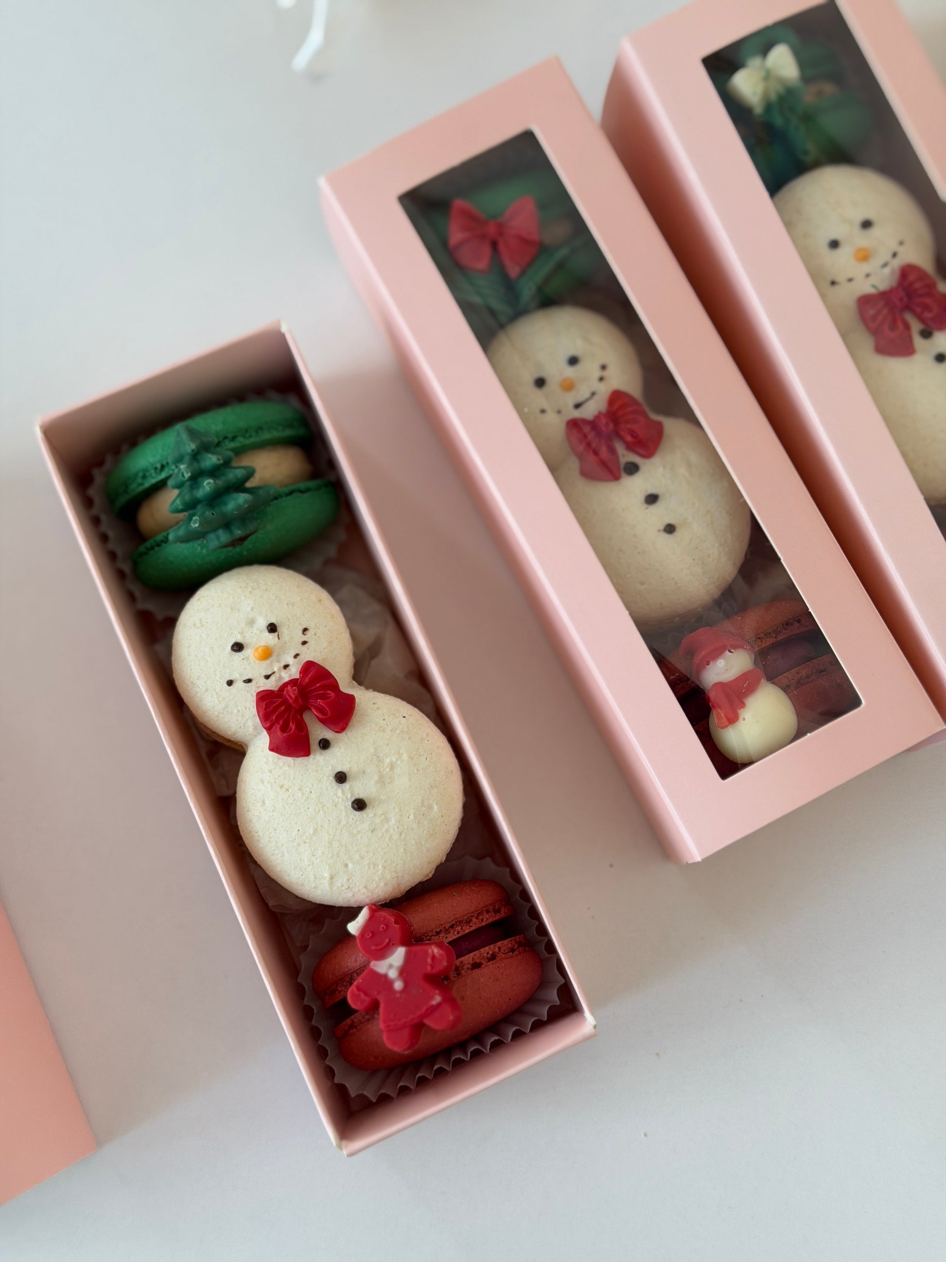Make the season special with our Christmas Macaron Gift Box, a limited-edition holiday treat perfect for gifting. This festive box includes three handcrafted macarons: two classic round macarons and one cute snowman macaron, decorated with holiday chocolate details.